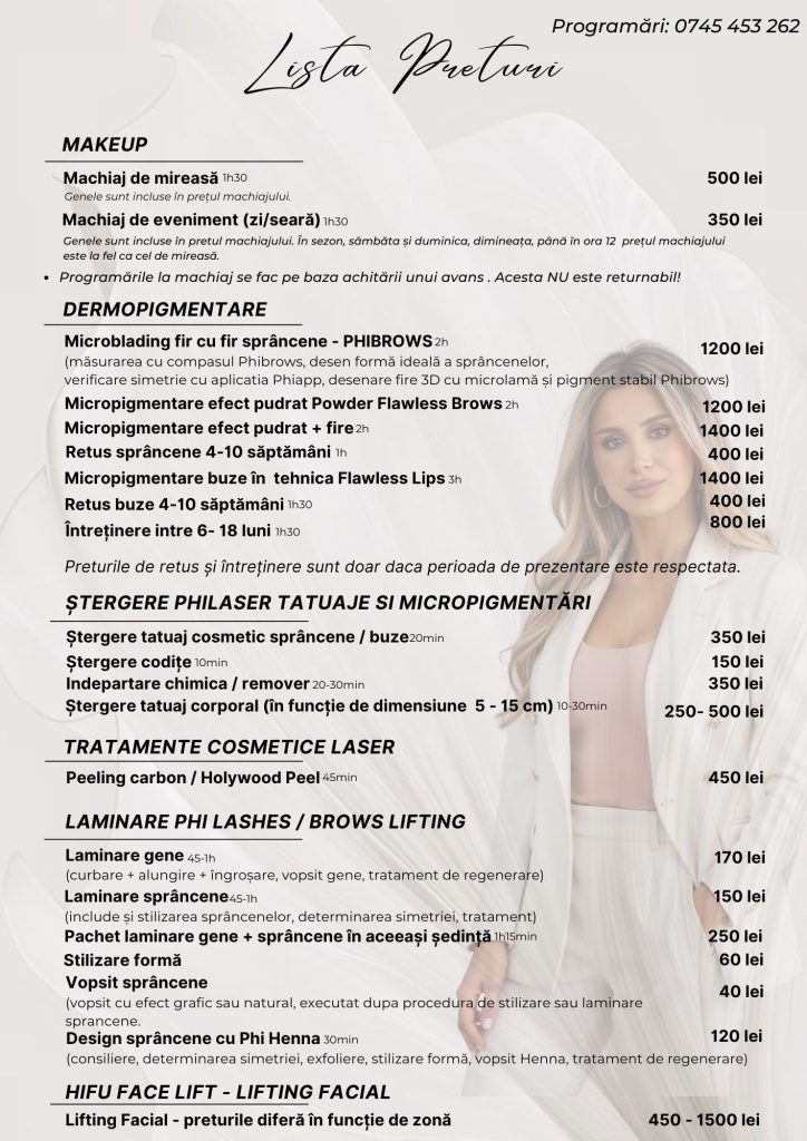 Ofer servicii specializate de microblading fir cu fir Phibrows, micropigmentare Powder brows și buze, machiaj profesional pentru evenimente, stilizare și laminare de sprâncene și gene, precum și îndepărtarea tatuajelor cu laser.