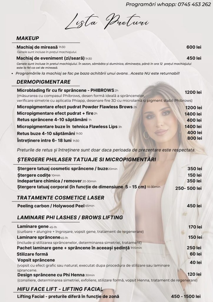 Ofer servicii specializate de microblading fir cu fir Phibrows, micropigmentare Powder brows și buze, machiaj profesional pentru evenimente, stilizare și laminare de sprâncene și gene, precum și îndepărtarea tatuajelor cu laser.
